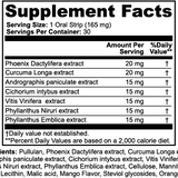 Ingredients: Pullulan, Pheonix Dactylifera extract, Curcuma Longa extract, Andrographis paniculate extract, Cichorium intybus extract, Vitis Vinifera extract, Phyllanthus Niruri extract, Phyllanthus Emblica extract, CEllulose, Mannitol, Licorice extract, Lecithin, Malic acid, Mango Flavor, Steviol glycosides, Orange flavor