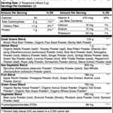 Ingredients: Great Grains Blend (Brown Rice Bran Powder, Organic Flex Powder, Barley Malt Powder), Herbal Blend (Organic Alfalfa Powder, Parsley Powder, Bee Pollen Powder, Siberian Ginseng Powder, Aloe Vera Powder, Astragalus Powder, Bilberry Powder, Ginger Powder, Gingko Biloba Powder, Green Tea Powder, Licorice Powder, Milk Thistle Powder, Peppermint Powder, Royal Jelly Powder, Schisandra Powder, Stevia Extract Powder), Sea Vegetable Powder (Spirulina Powder, Chlorella Powder, Sea Whistle Powder), Fruit Blend (Apple Pectin Powder, Pineapple Powder, Grape Skin Extract, Acerola Juice Powder), Green Grass Blend (Organic Barley Grass Powder, Organic Kamut Grass Powder, Organic Oat Grass Powder, Organic Rye Grass Powder, Organic Wheat Grass Powder), Vegetable Blend (Beet Juice Powder, Broccoli Powder, Rhubarb Juice Powder, Spinach Powder), Fructooligosaccharides (FOS), silica.