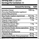 Ingredients: Horny Goat Weed Extract, Maca Root Powder, Mucuna Pruriens 15% L-Dopa, Polypodium Vulgare Powder, Tongkat Ali Root Powder, Saw Palmetto Berry Powder, Muira Puama Root Powder, L-Arginine HCL, Panax Ginseng Root Powder, Gelatin Capsule, Rice Flour, Vegetable Magnesium Stearate.