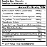 Ingredients: Turmeric Root Powder, Glucosamine Sulfate 2KCI, Turmeric 95% Curcuminoids, Ginger Root Extract, Chondroitin Sulfate, Boswellia Extract, MSM, BioPerine®, Quercetin Dihydrate, L-Methionine, Bromelain, Cellulose (vegetable capsule), Rice Flour.